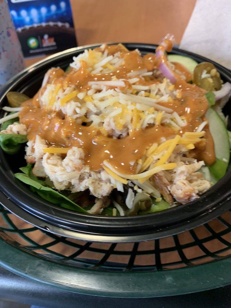 Satisfy your hunger like a pro with tender grilled chicken strips marinated in our Sweet Onion Teriyaki sauce. American cheese adds a creamy richness, while lettuce, spinach, black olives, tomatoes, crisp green peppers, red onions and sliced cucumbers provide a satisfying crunch. Served up as a salad with another pass of Sweet Onion Teriyaki sauce to top it off. It's a winning combination of flavors.